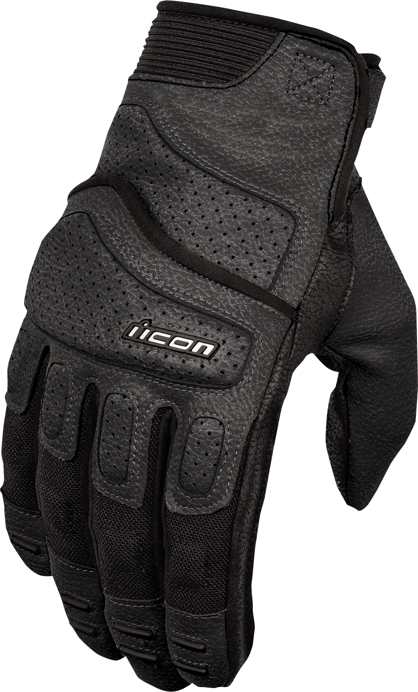Кожаные мотоперчатки Icon Superduty3 CE Gloves черного цвета – это уже третье поколение популярной линейки перчаток от известного американского бренда. Примечательность данной модели в удачном сочетании современных высокотехнологичных материалов и последних инженерных достижений в сфере защитного и эргономического функционала мотоэкипировки. Вся внутренняя часть ладони и значительная часть тыльной стороны кисти выполнены из технологической кожи Axe Laredo с перфорацией, которая по многим параметрам прочности и практичности превосходит натуральную кожу. Для дополнительной гибкости и улучшения вентиляции предусмотрены вставки из сетчатого полиэфирного волокна.